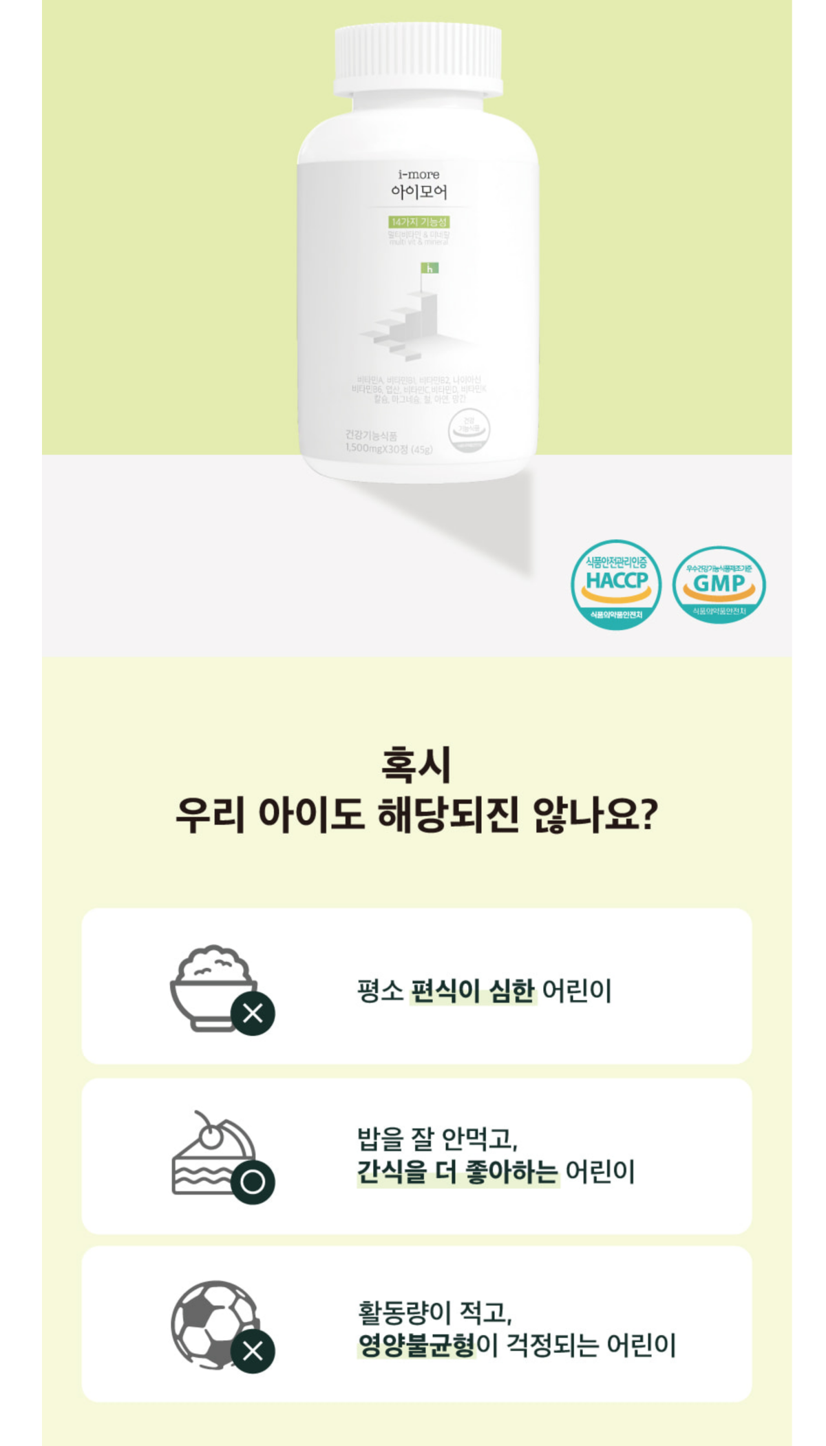 아이하이 아이모어는 성장기 아이들을 위한 종합 영양제로, 비타민과 미네랄을 풍부하게 함유하여 아이의 건강한 성장과 면역력 증진에 도움을 줍니다. 특히, 아이하이 아이모어는 칼슘, 비타민 D 등 뼈 건강에 필요한 성분을 포함하고 있어 성장판 발달에 큰 역할을 합니다. 또한, 아이하이 아이모어는 맛과 품질 모두를 만족시켜 아이들이 거부감 없이 섭취할 수 있는 제품으로, 많은 부모님들 사이에서 인기를 끌고 있습니다.